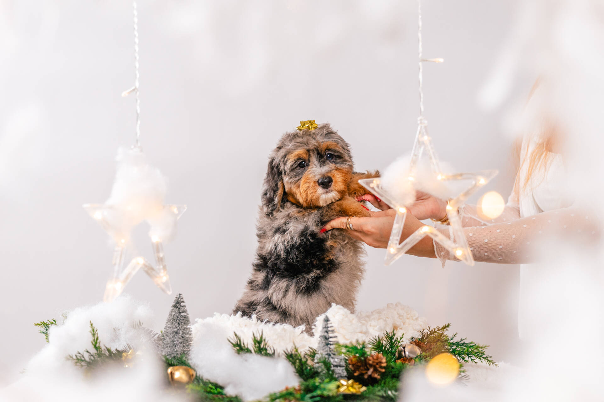 Meet Dorian, a handsome mini Bernedoodle whose stunning merle coat is a work of art, swirling with unique colors and charm. He has a playful heart that’s always ready for a game of fetch and a loving soul that craves gentle cuddles. Dorian is eager to bring his special brand of joy, loyalty, and picture-perfect companionship to a loving family.
