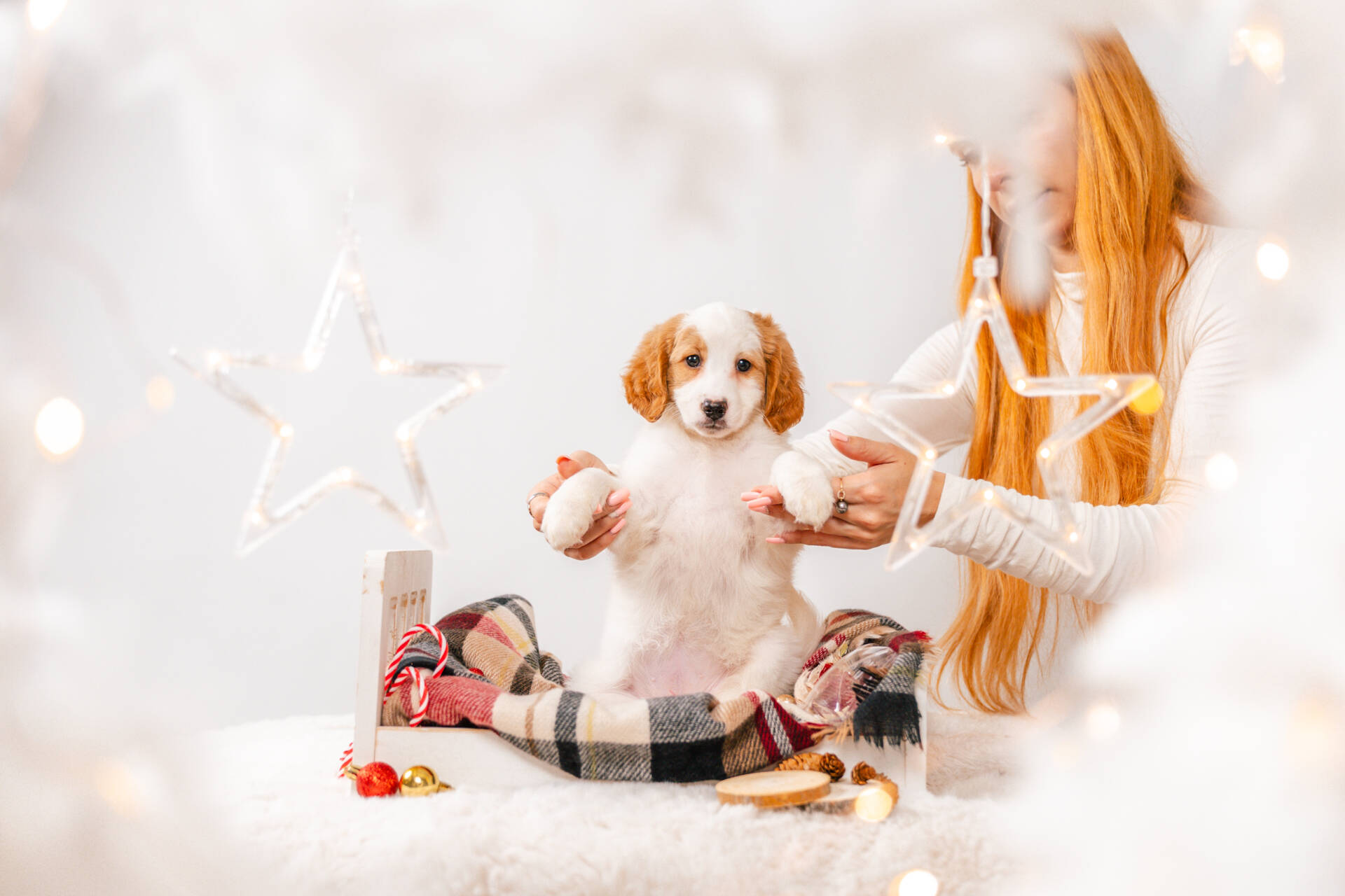 Meet Fairy, a truly enchanting mini Bernedoodle with beautiful white and golden markings. Her unique, unfurnished coat is wonderfully soft and easy to care for, perfect for snuggling up after a day of play. This sweet and loving girl has a magical way of spreading happiness and is ready to bring a touch of wonder into her forever home.