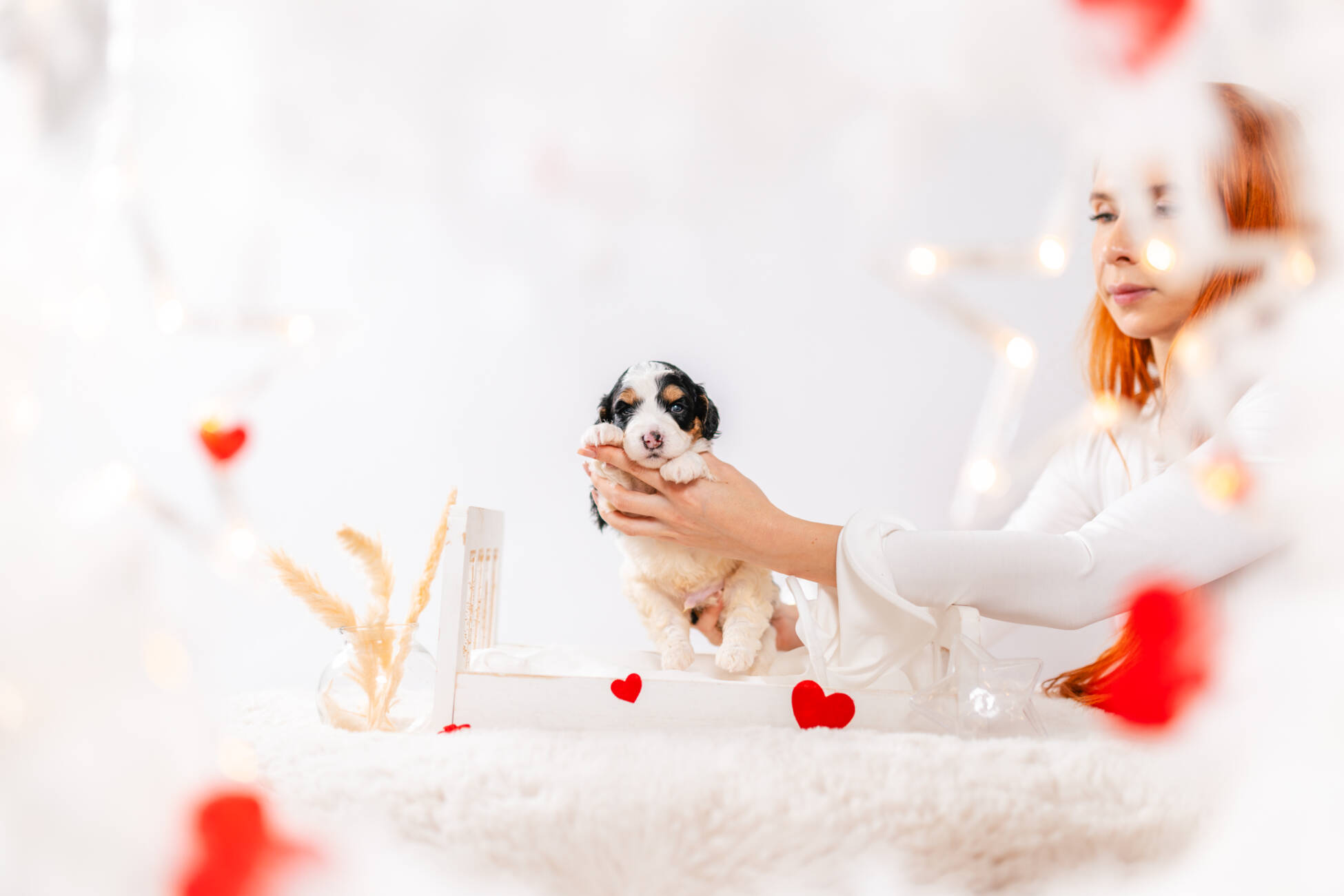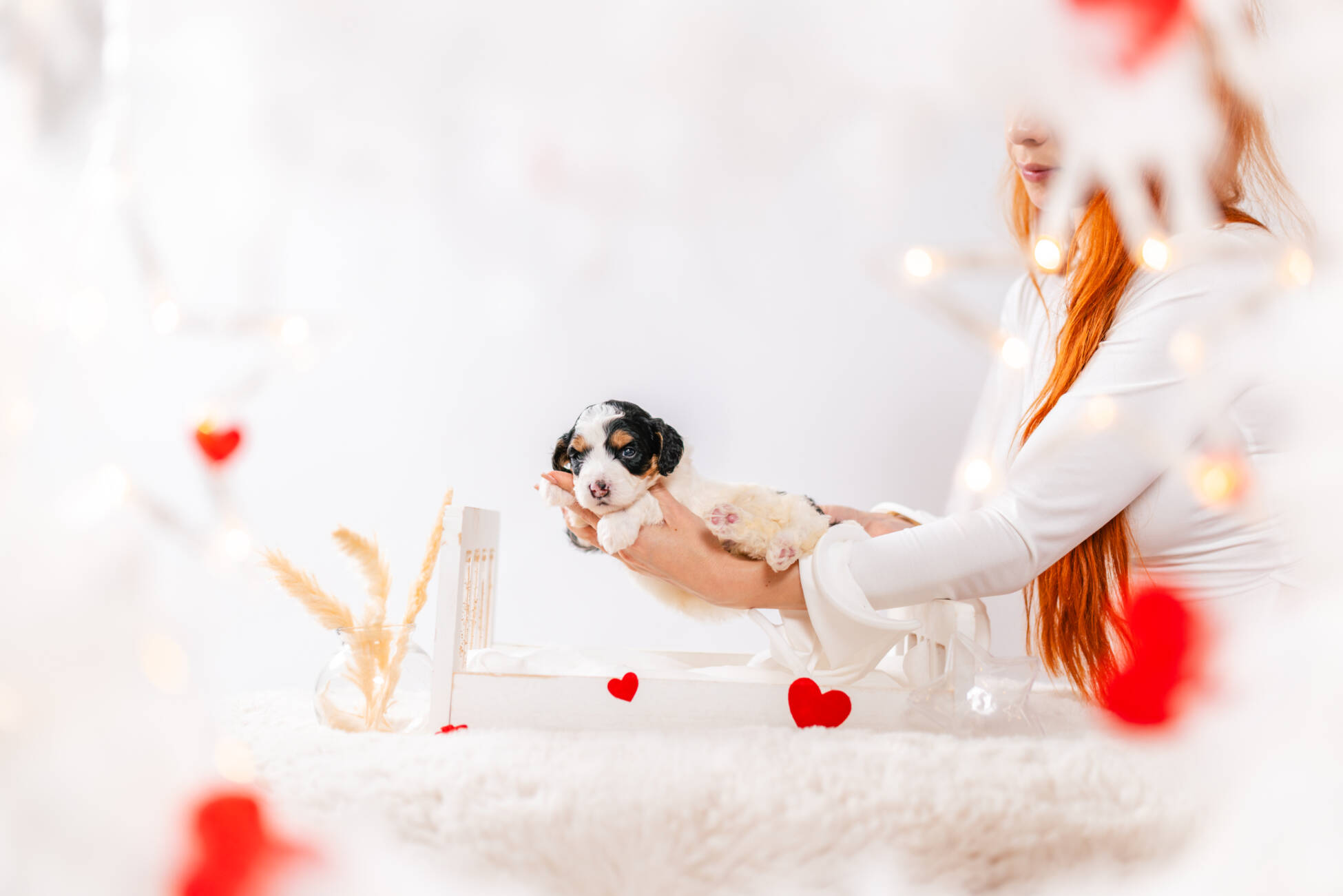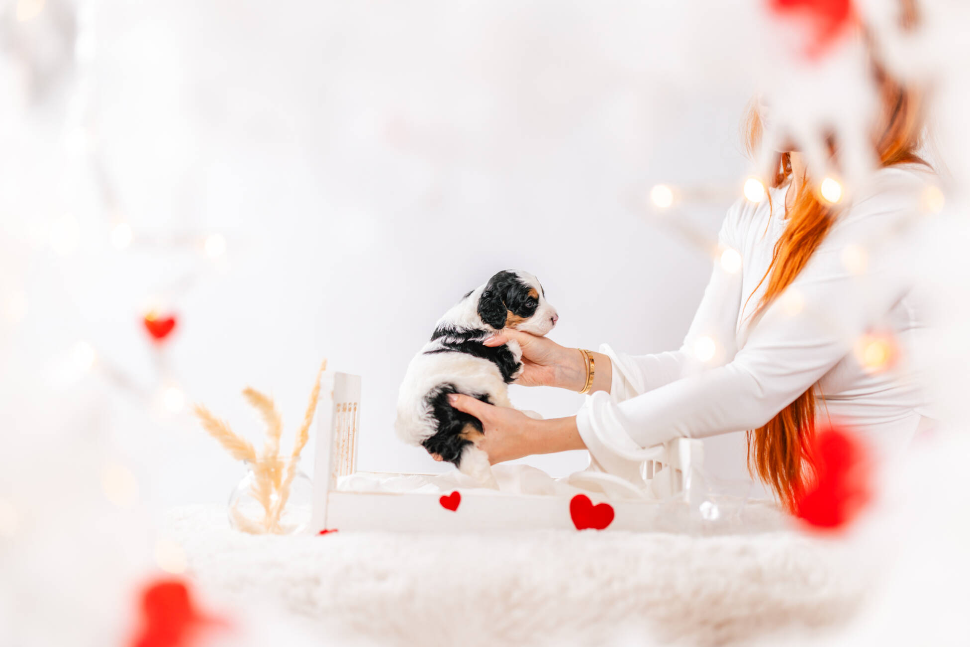 • We Breed: Mini F1 Bernedoodle (Bernese Mountain dog + Mini Poodle)