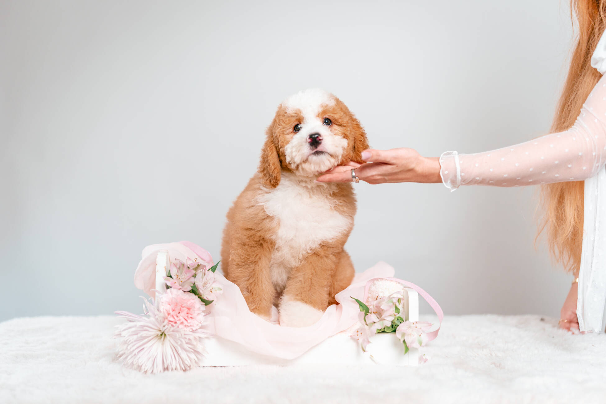 Meet Fudge, a delightful F2 Mini Bernedoodle boy whose golden coat and sweet white markings make him just as irresistible as his name suggests! This affectionate pup is expected to mature into a perfect, huggable size of 30-40 lbs, making him the ideal cuddle buddy for cozy nights and sunny days alike. His hypoallergenic, non-shedding fur means you can indulge in endless snuggles without the worry of allergies or messy cleanup. With a heart full of sweetness and a playful spirit, Fudge is ready to melt your heart and become your family’s most cherished companion.