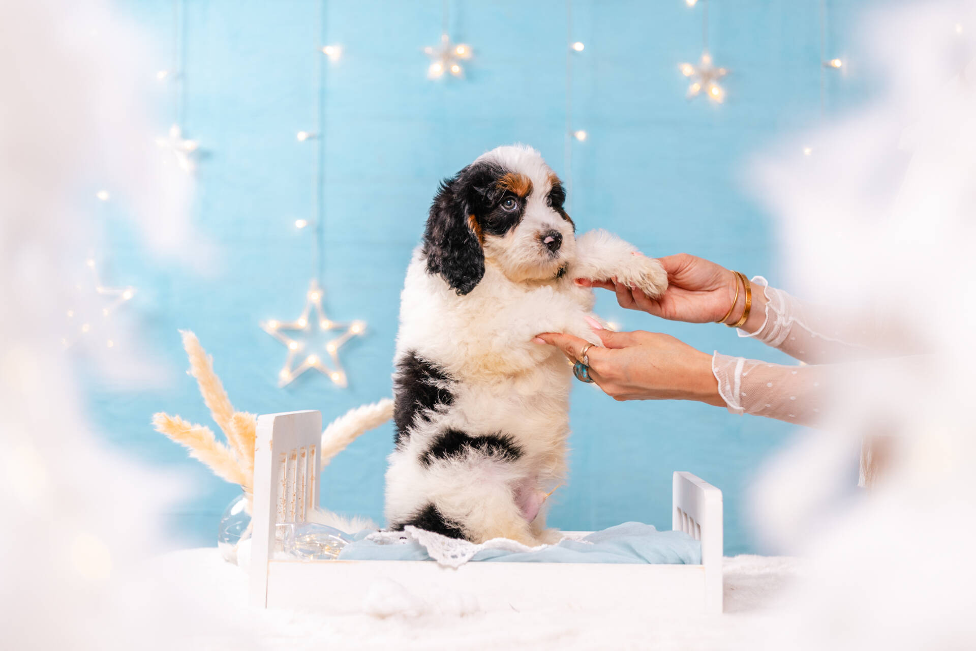 Meet Gatsby, a dapper Mini Bernedoodle boy with a look straight out of a storybook! His stunning, non-shedding parti coat features crisp white fur playfully marked with bold black patches. The detail that truly sets him apart is his set of charming brown eyebrows, giving him an expressive, thoughtful gaze that will melt your heart. Gatsby has a personality as grand as his name, full of love, loyalty, and a playful spirit. He’s the perfect companion for glamorous adventures or cozy nights in. This one-of-a-kind boy is ready to become the great love of his forever family’s life.