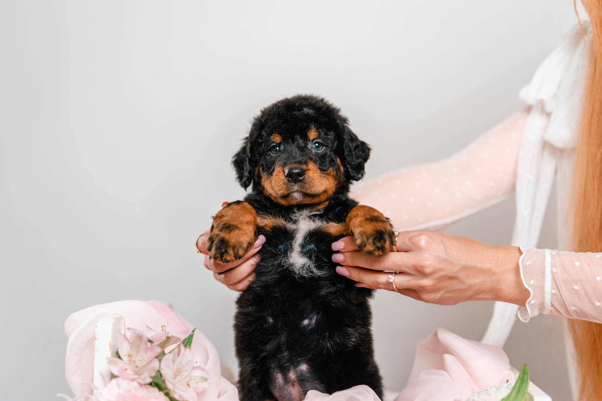 • Breed: Standard F1b Reversed Bernedoodle (Bernese Mountain Dog + St. Bernedoodle)