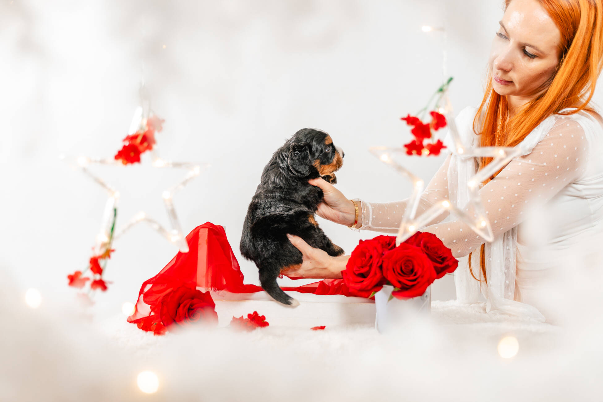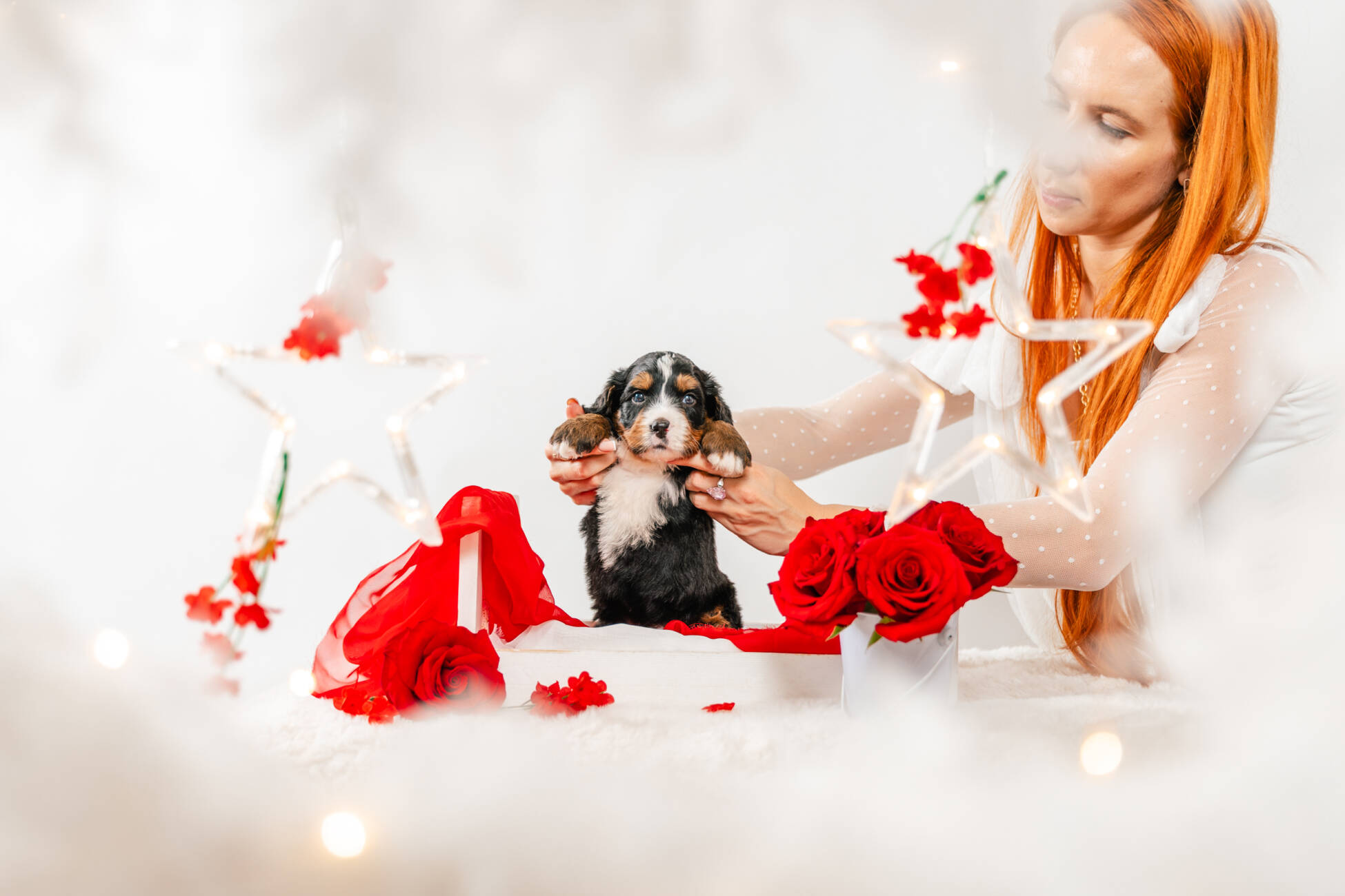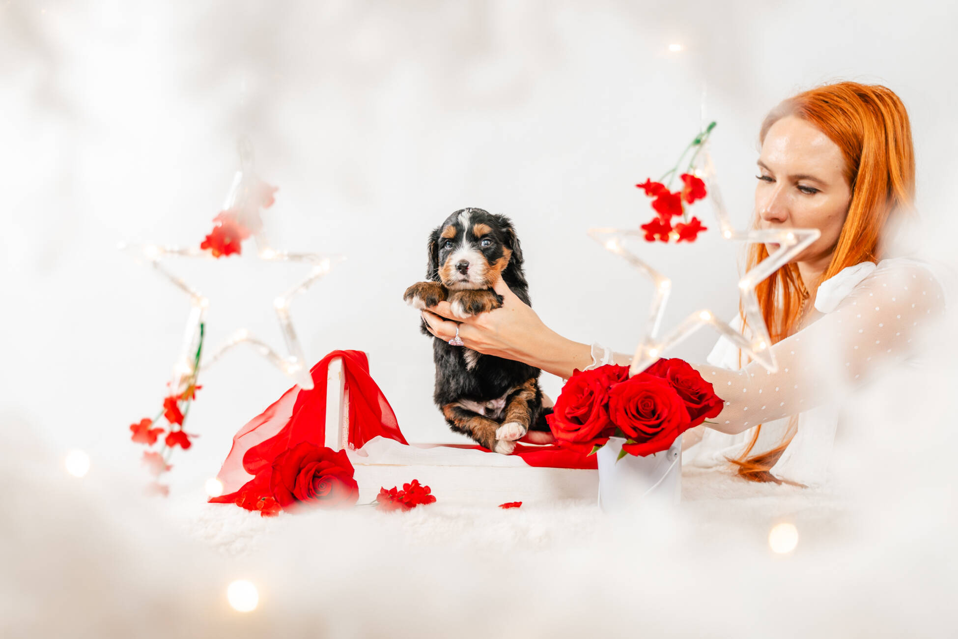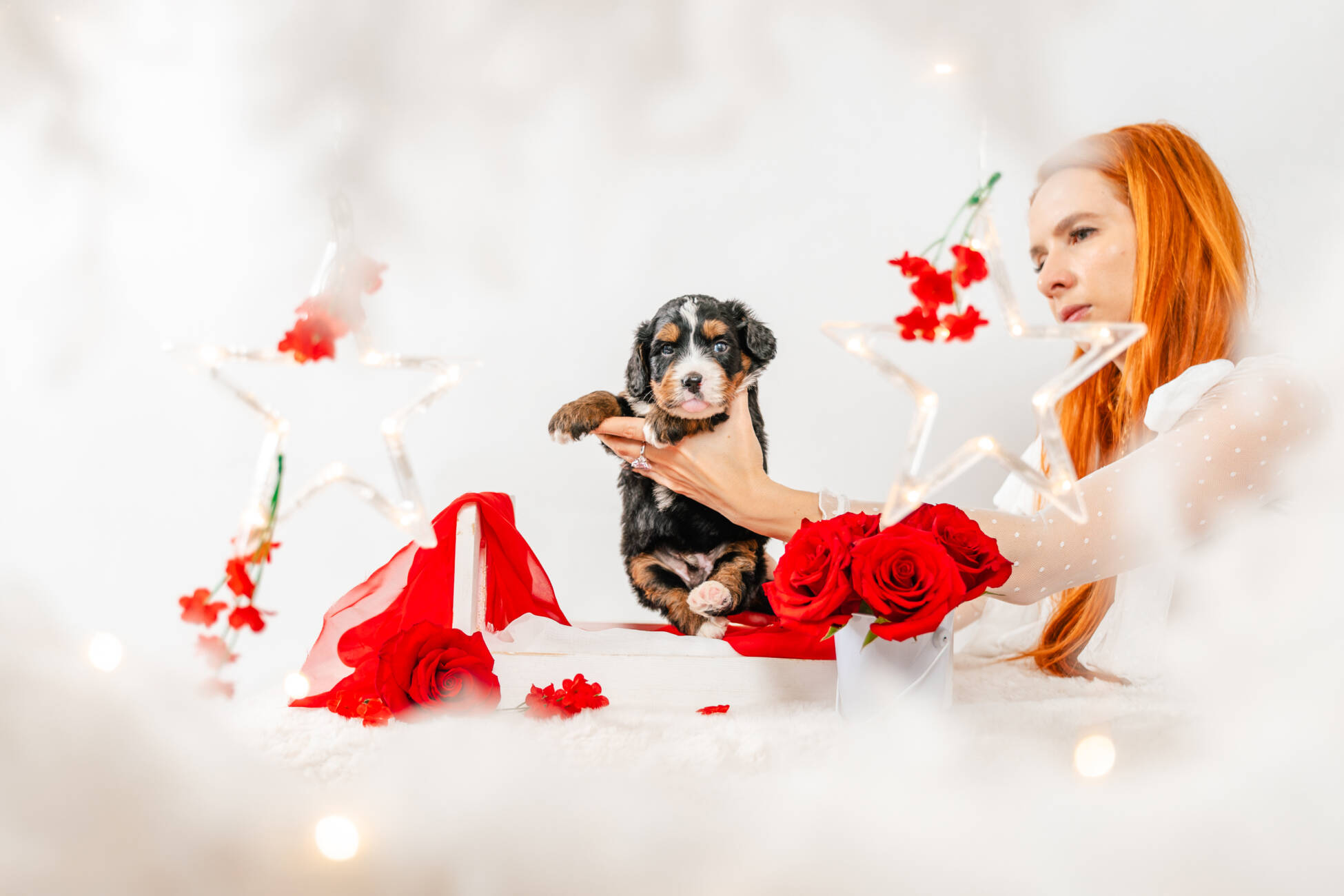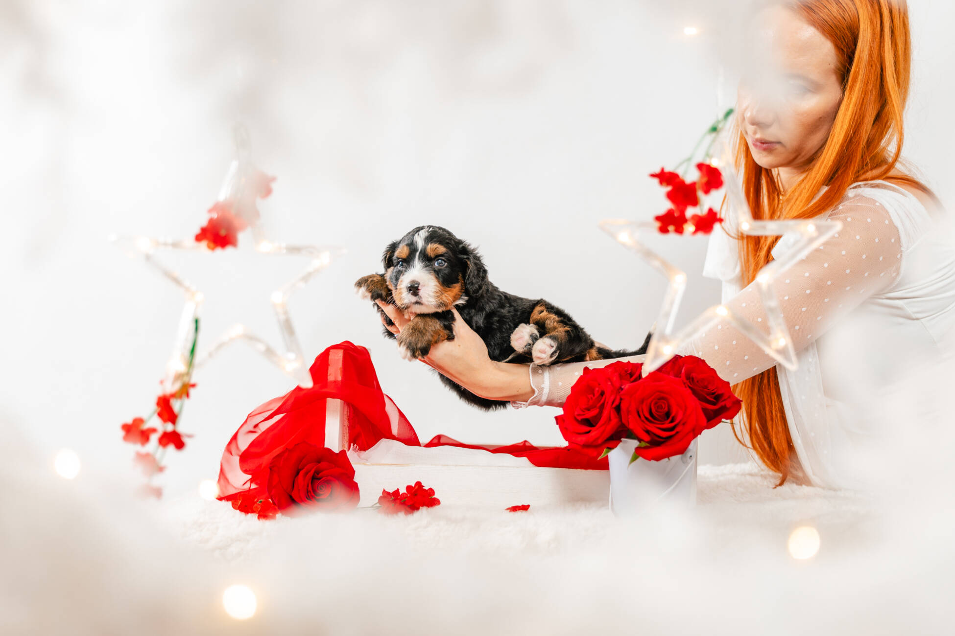 • We Breed: Mini F1 Bernedoodle (Bernese Mountain dog + Mini Poodle)