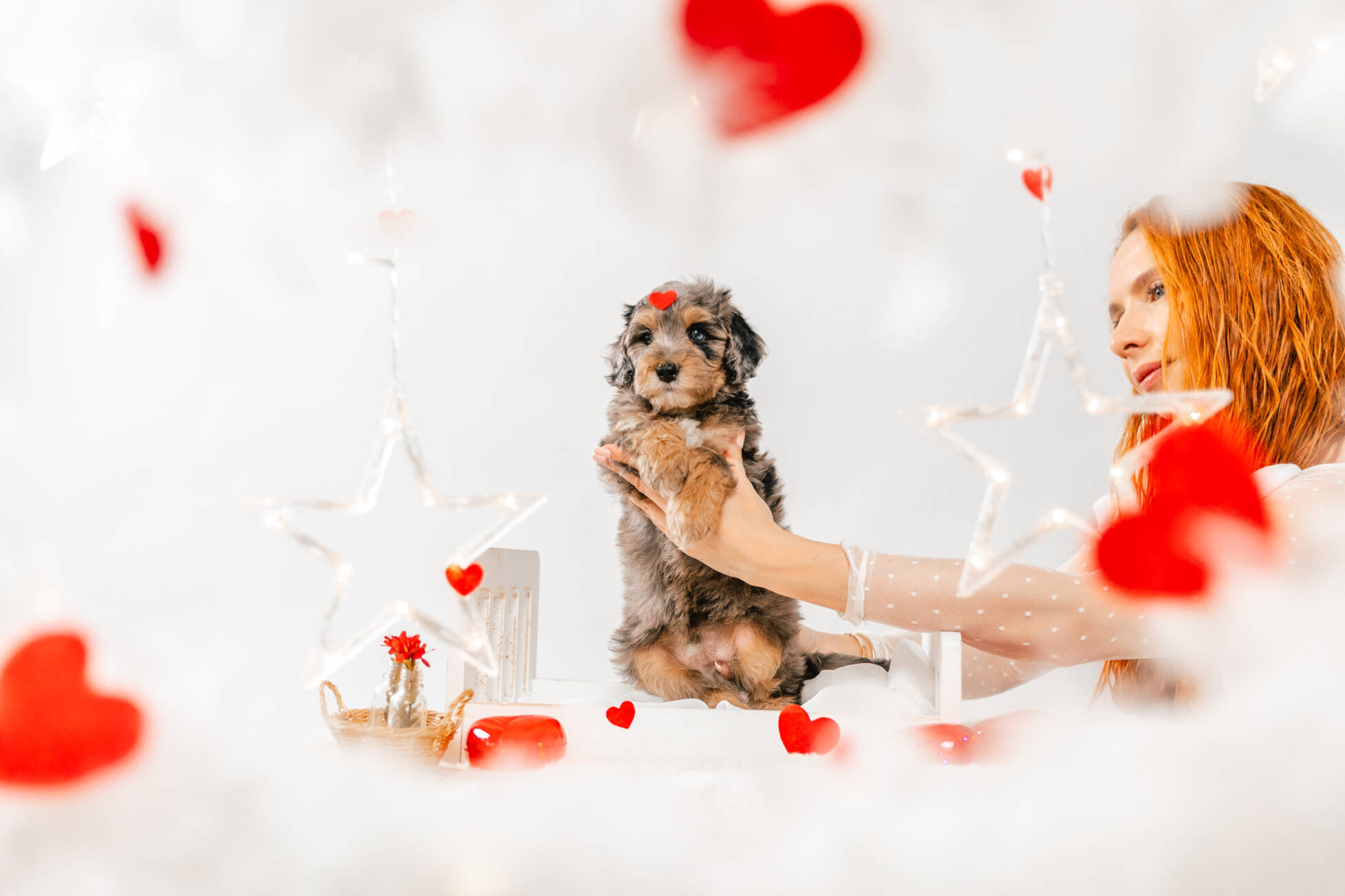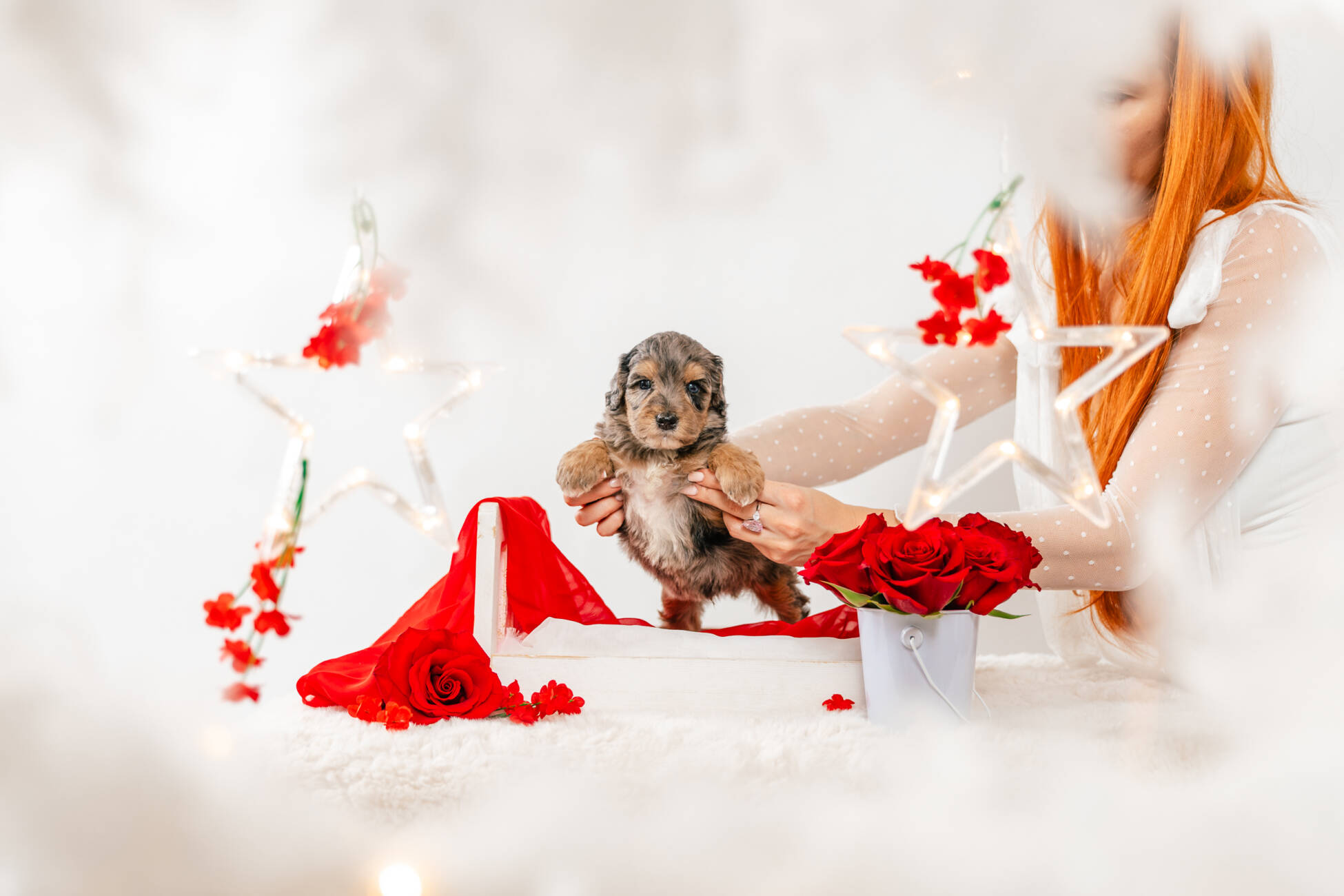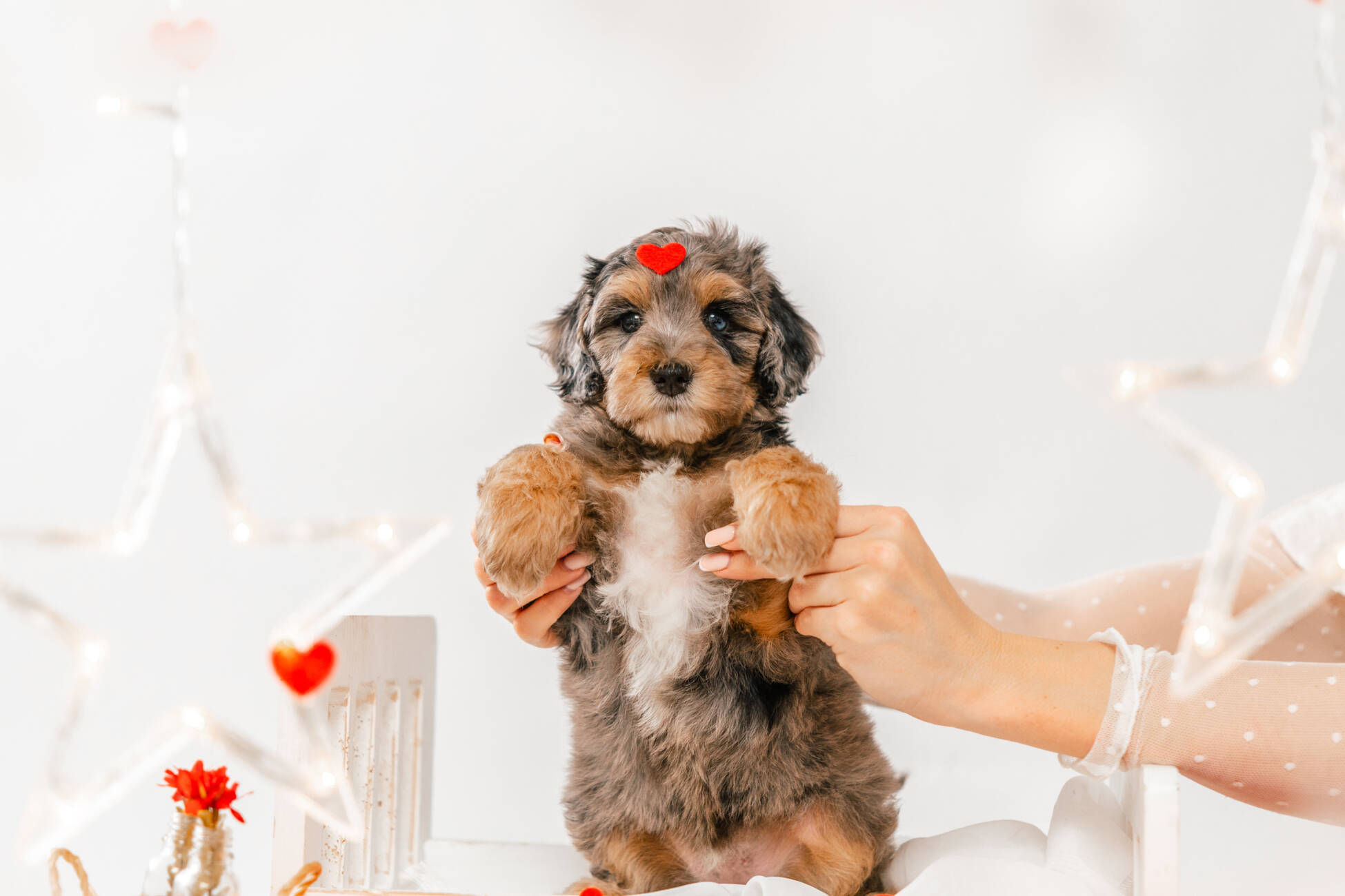 • We Breed: Mini F1 Bernedoodle (Bernese Mountain dog + Mini Poodle)