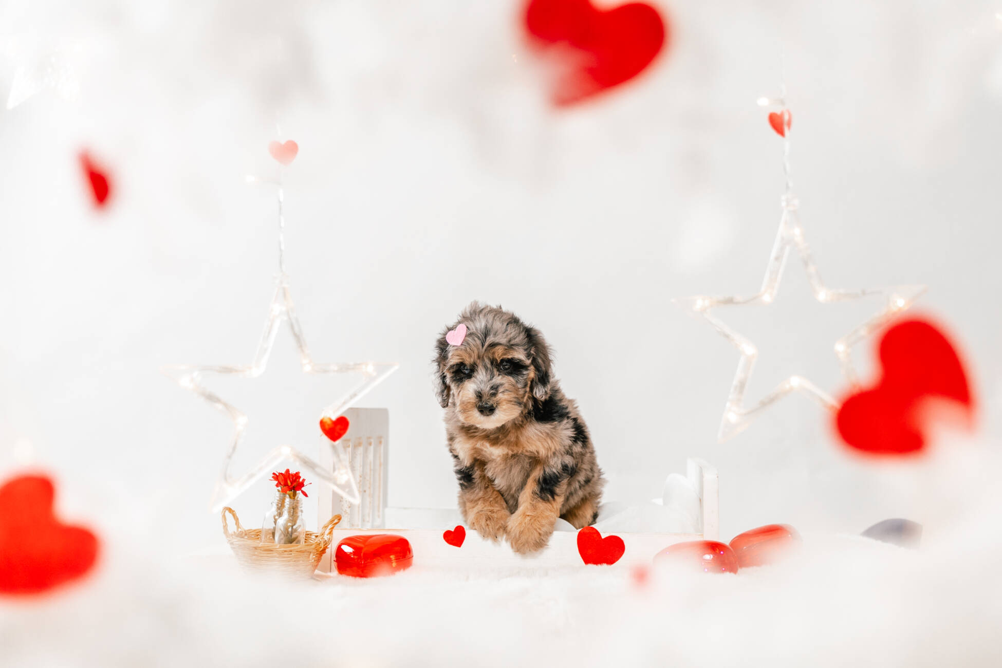 Meet Molly, a beautiful F1b mini Bernedoodle girl whose stunning merle coat is both eye-catching and wonderfully non-shedding. Expected to grow to a perfect medium size of 25-30 lbs, she is the ideal partner for both spirited playtime and cozy cuddles on the couch. Molly is ready to fill your home with laughter and affection, promising to be the loyal best friend you have always dreamed of.