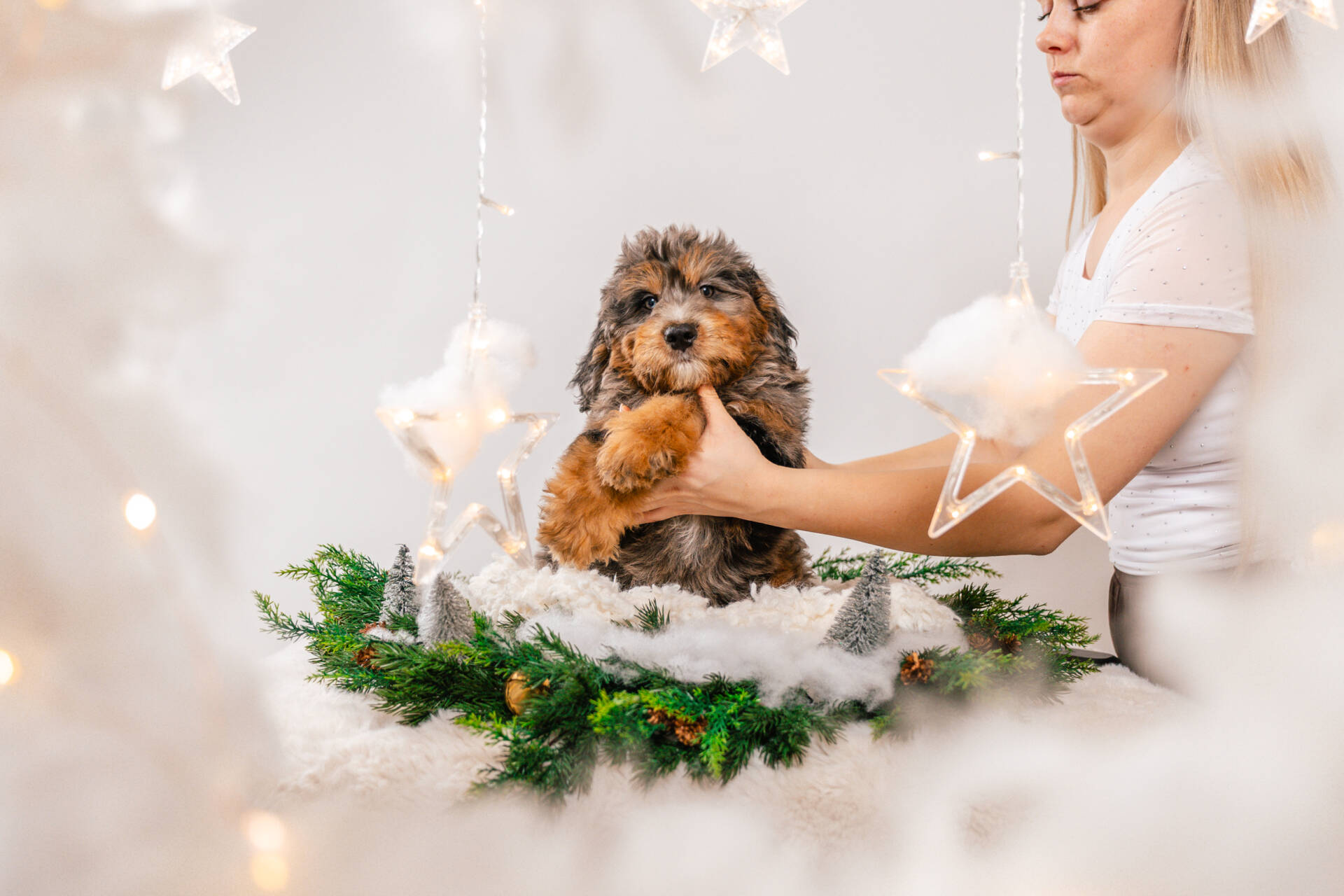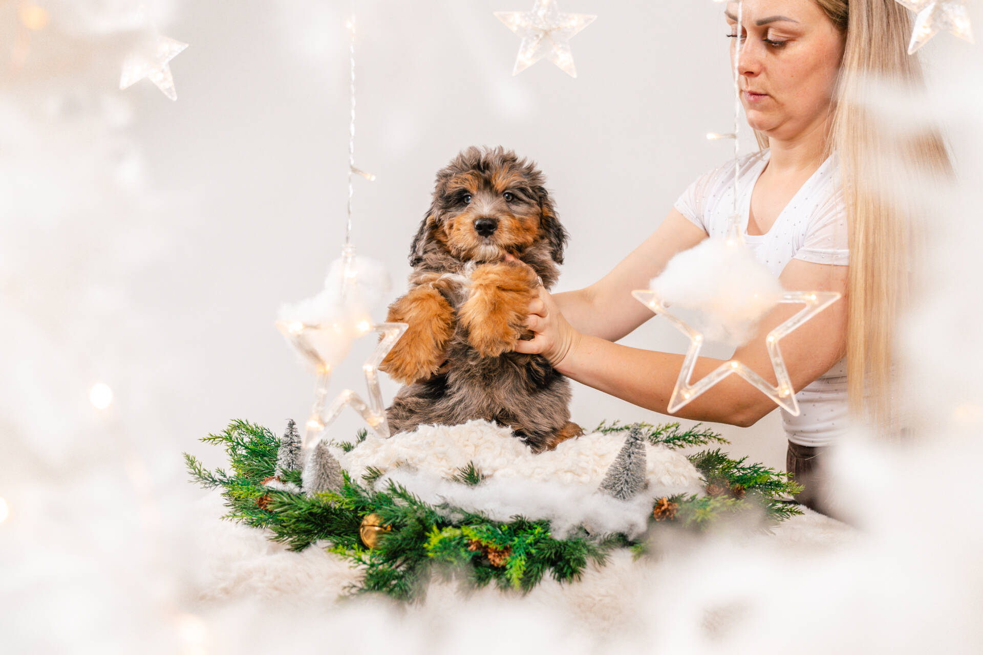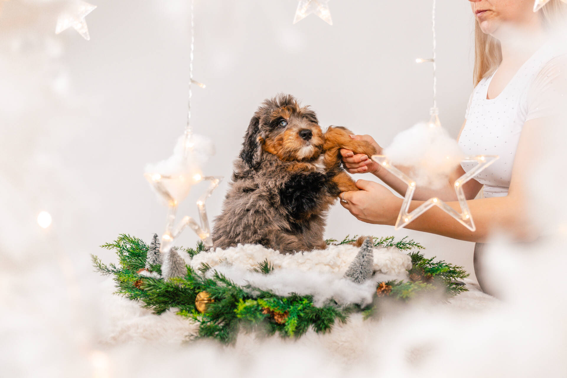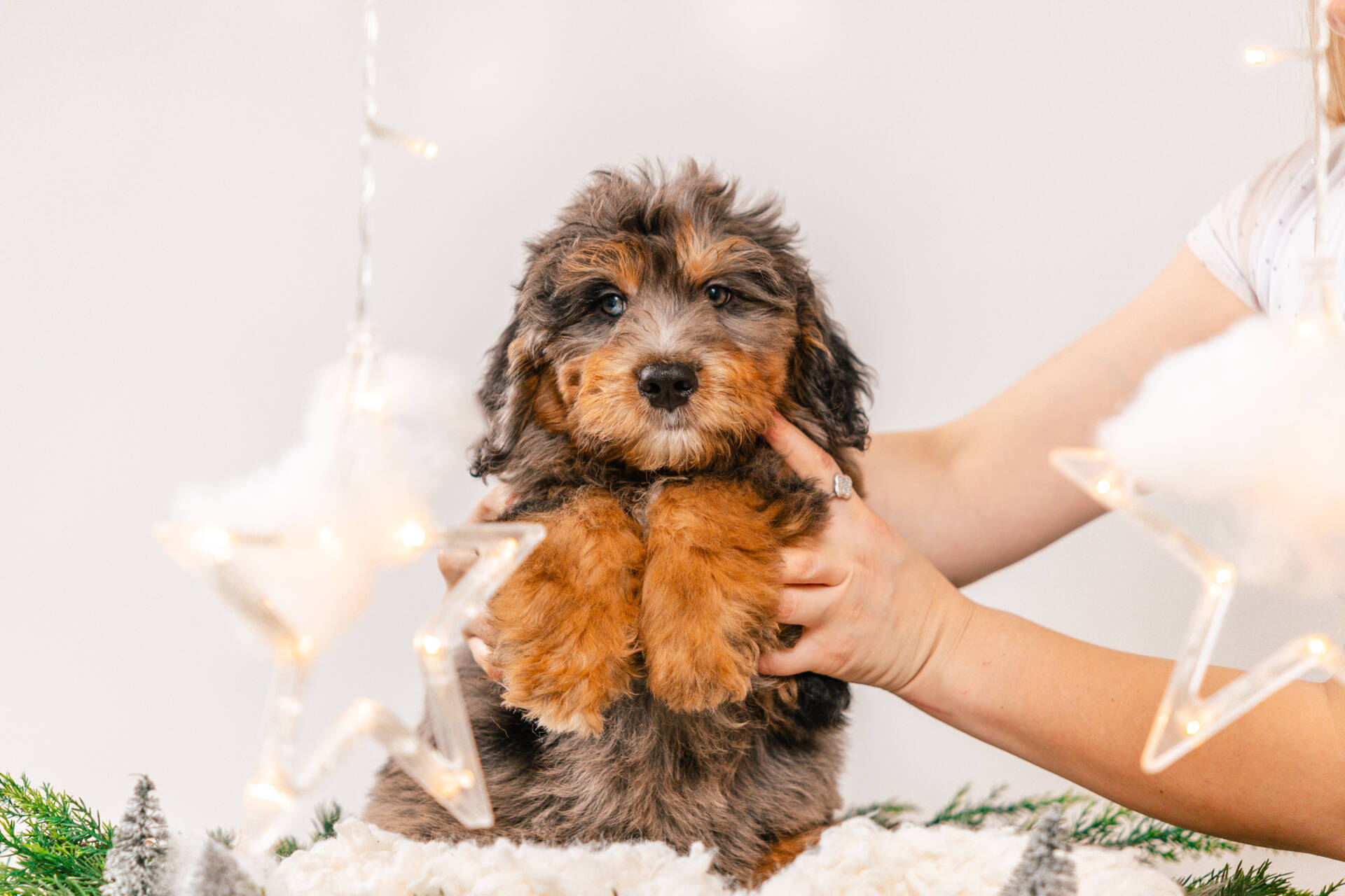 • We Breed: Mini F1 Bernedoodle (Bernese Mountain dog + Mini Poodle)