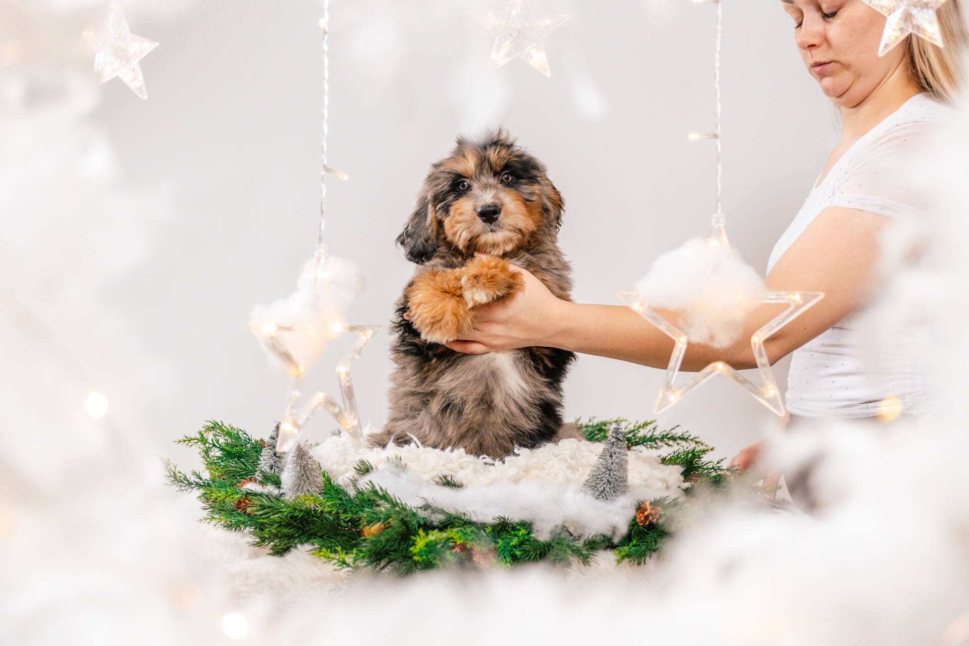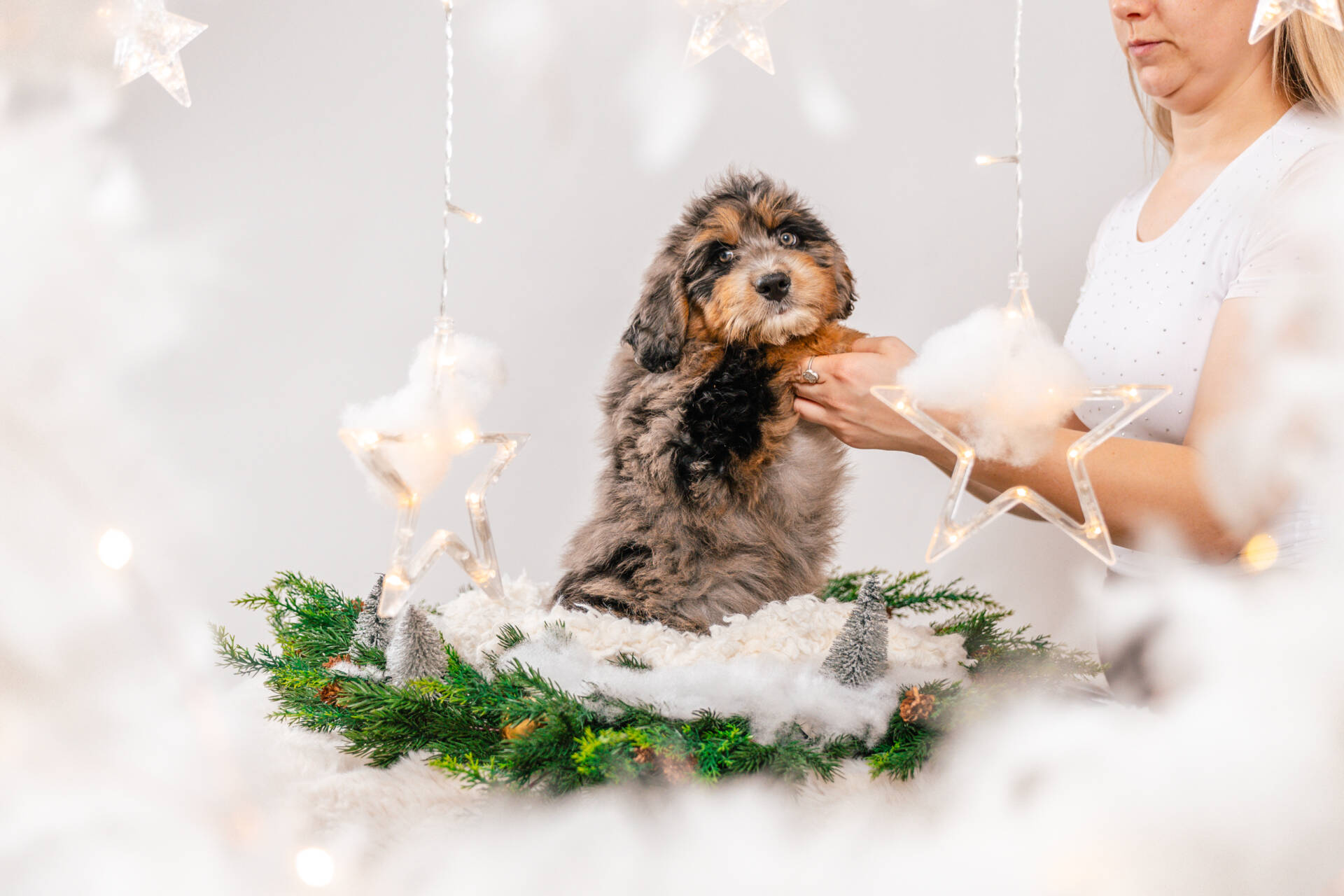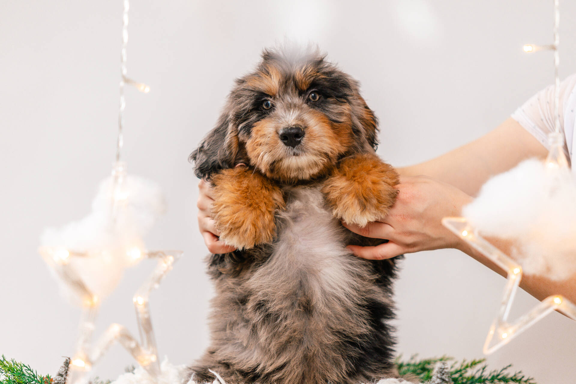 • We Breed: Mini F1 Bernedoodle (Bernese Mountain dog + Mini Poodle)