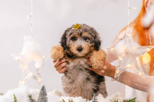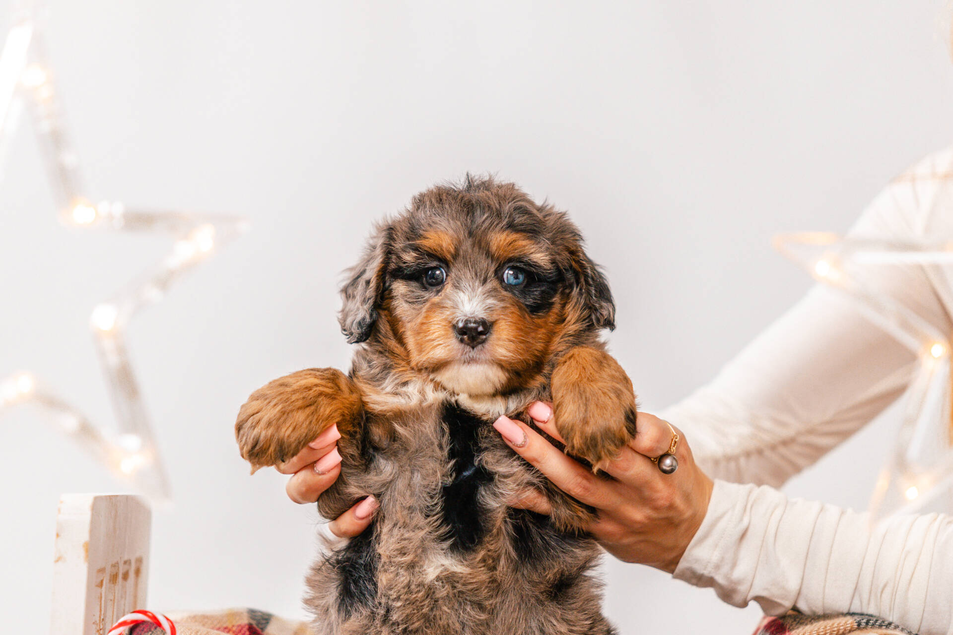 Meet Olive, a captivating F1 mini Bernedoodle girl whose gorgeous merle coat and one striking blue eye make her truly unforgettable. She is a perfect blend of playful spirit and gentle affection, always ready for a fun game before snuggling in close for a warm cuddle. Olive is so excited to find her forever family and fill their home with a lifetime of joy, loving companionship, and sweet puppy kisses.