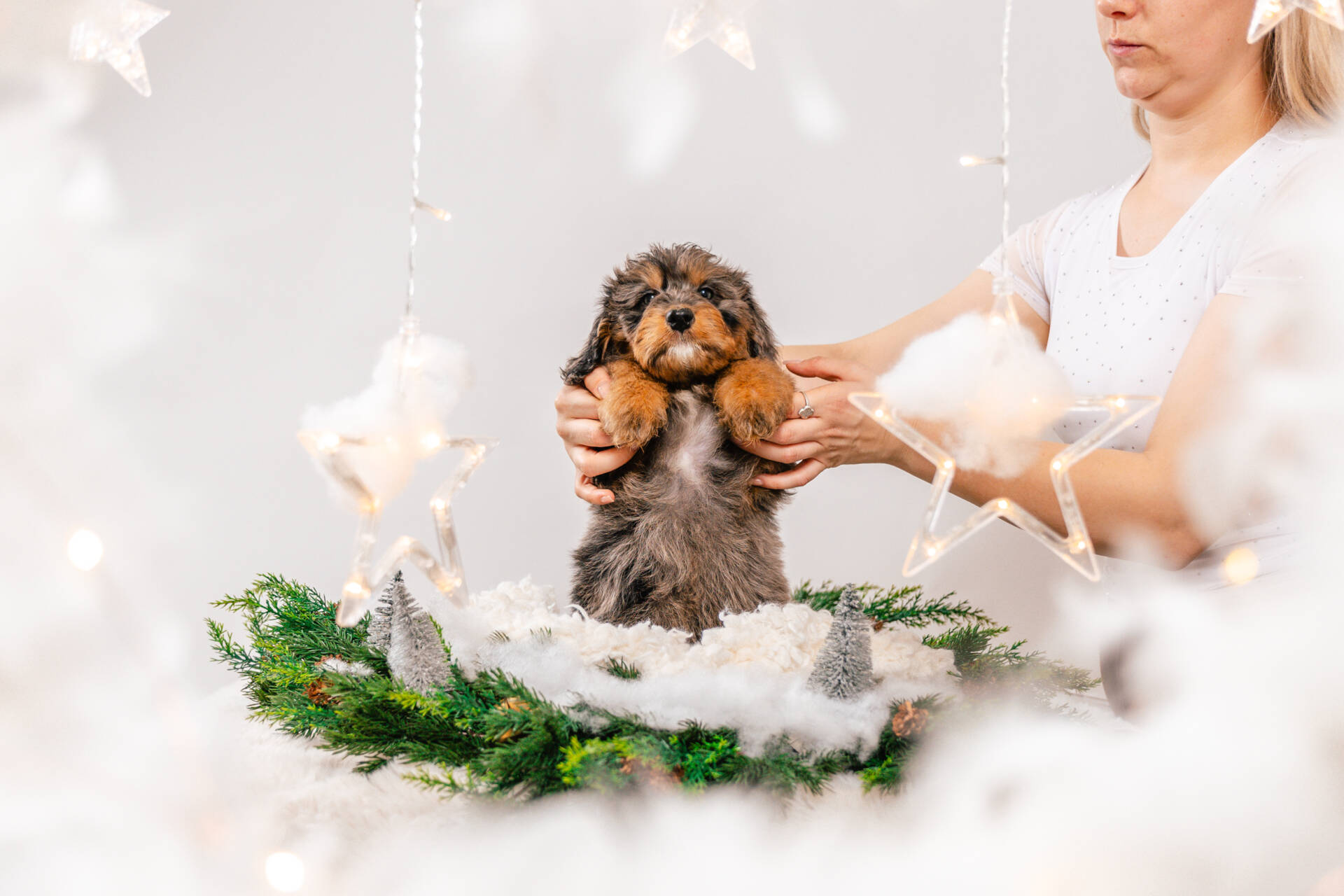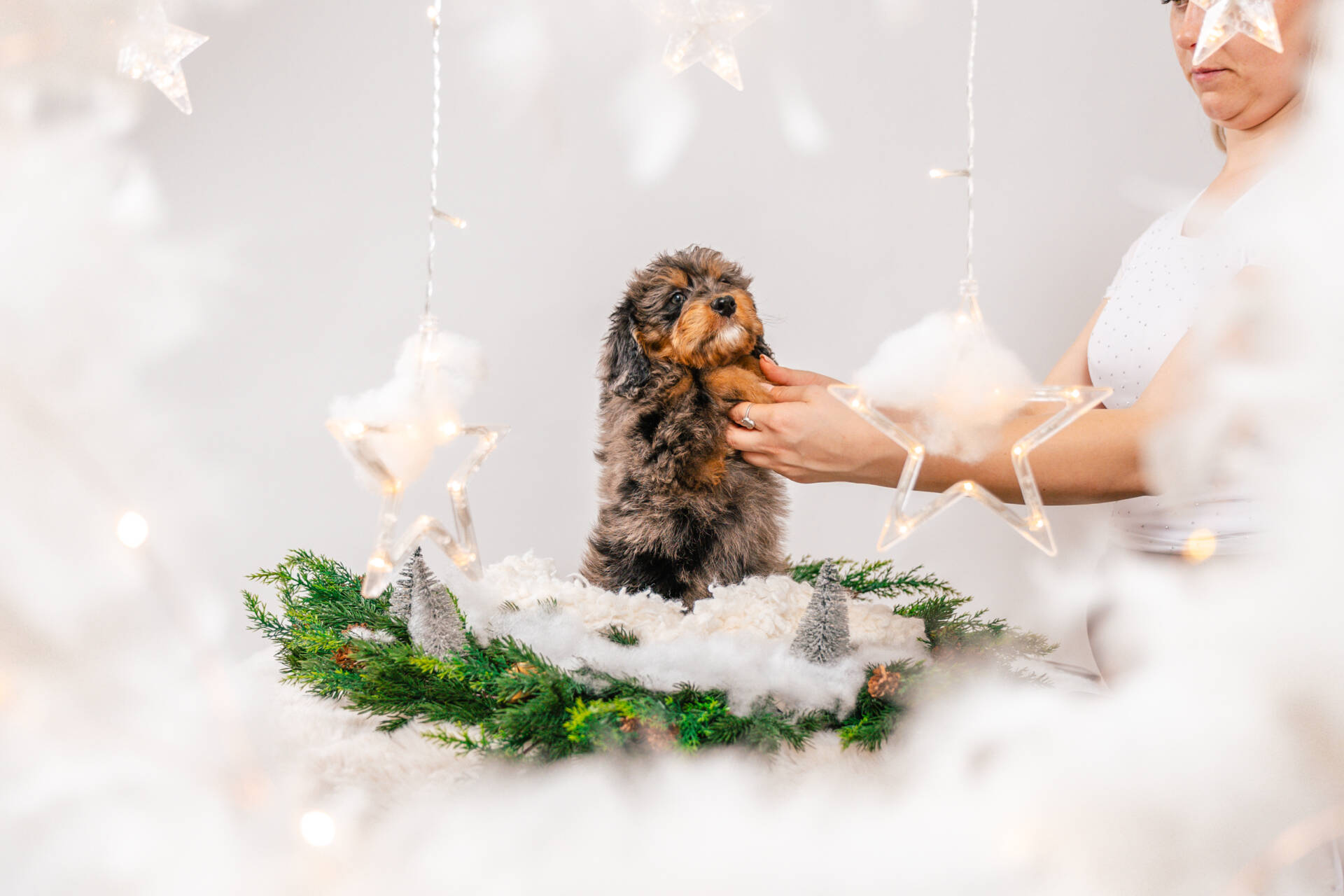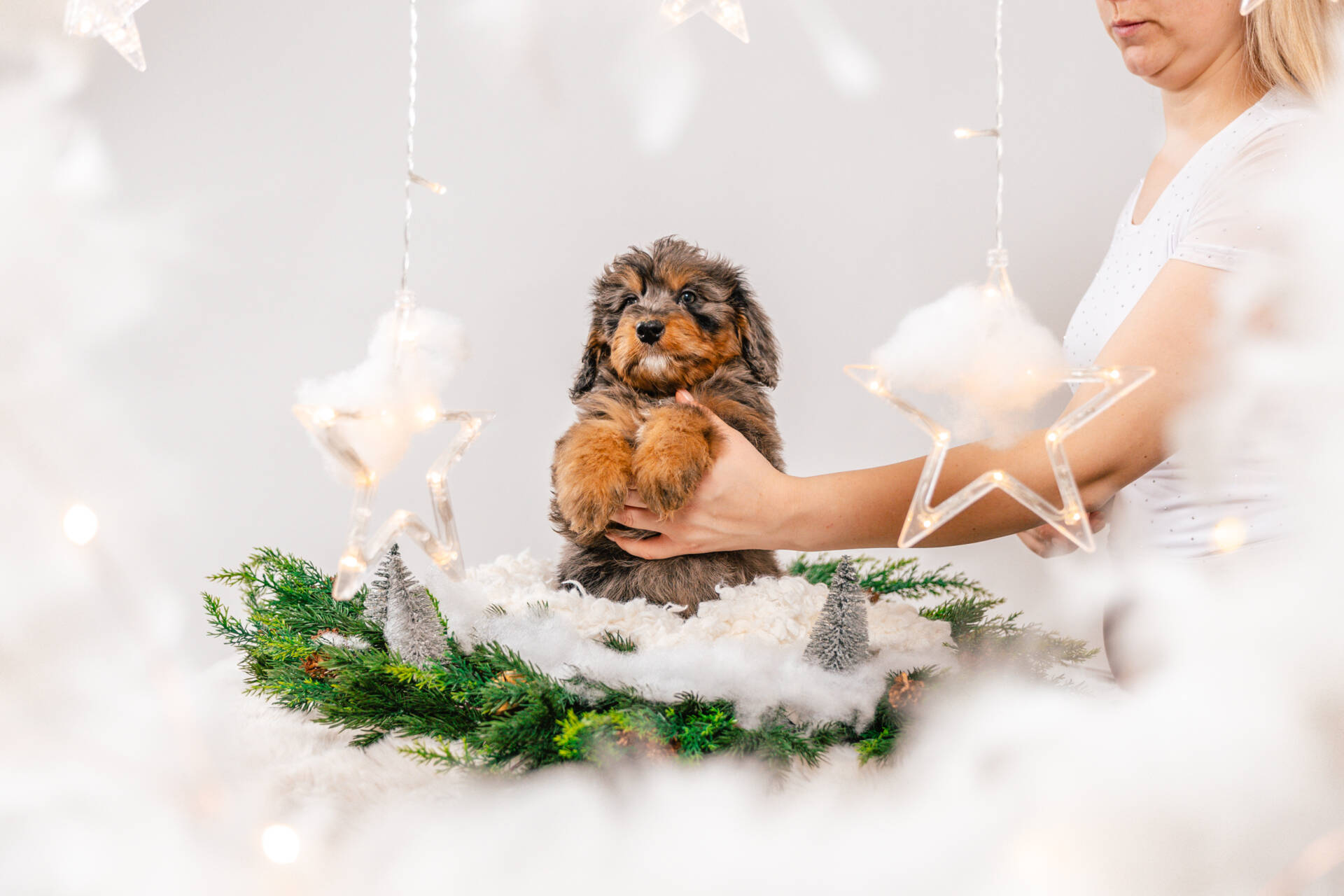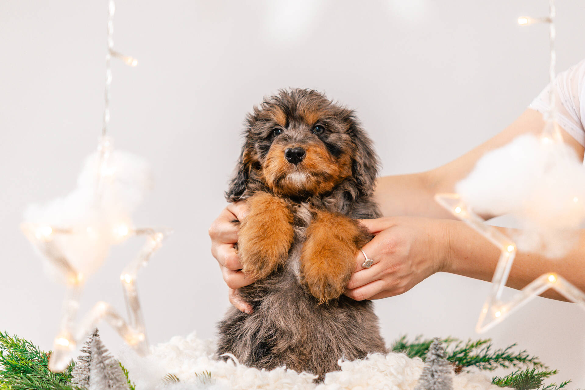 • We Breed: Mini F1 Bernedoodle (Bernese Mountain dog + Mini Poodle)