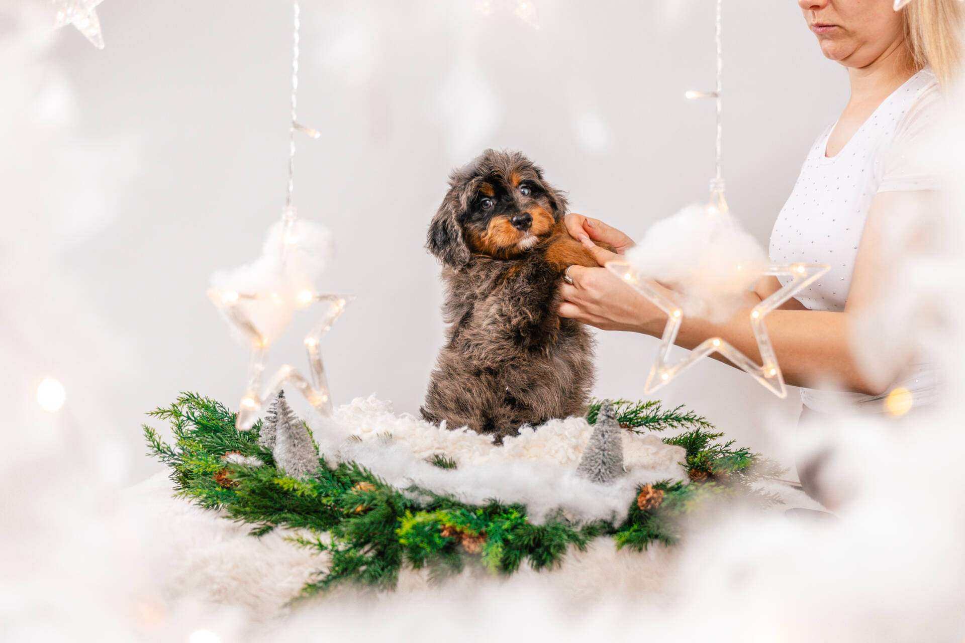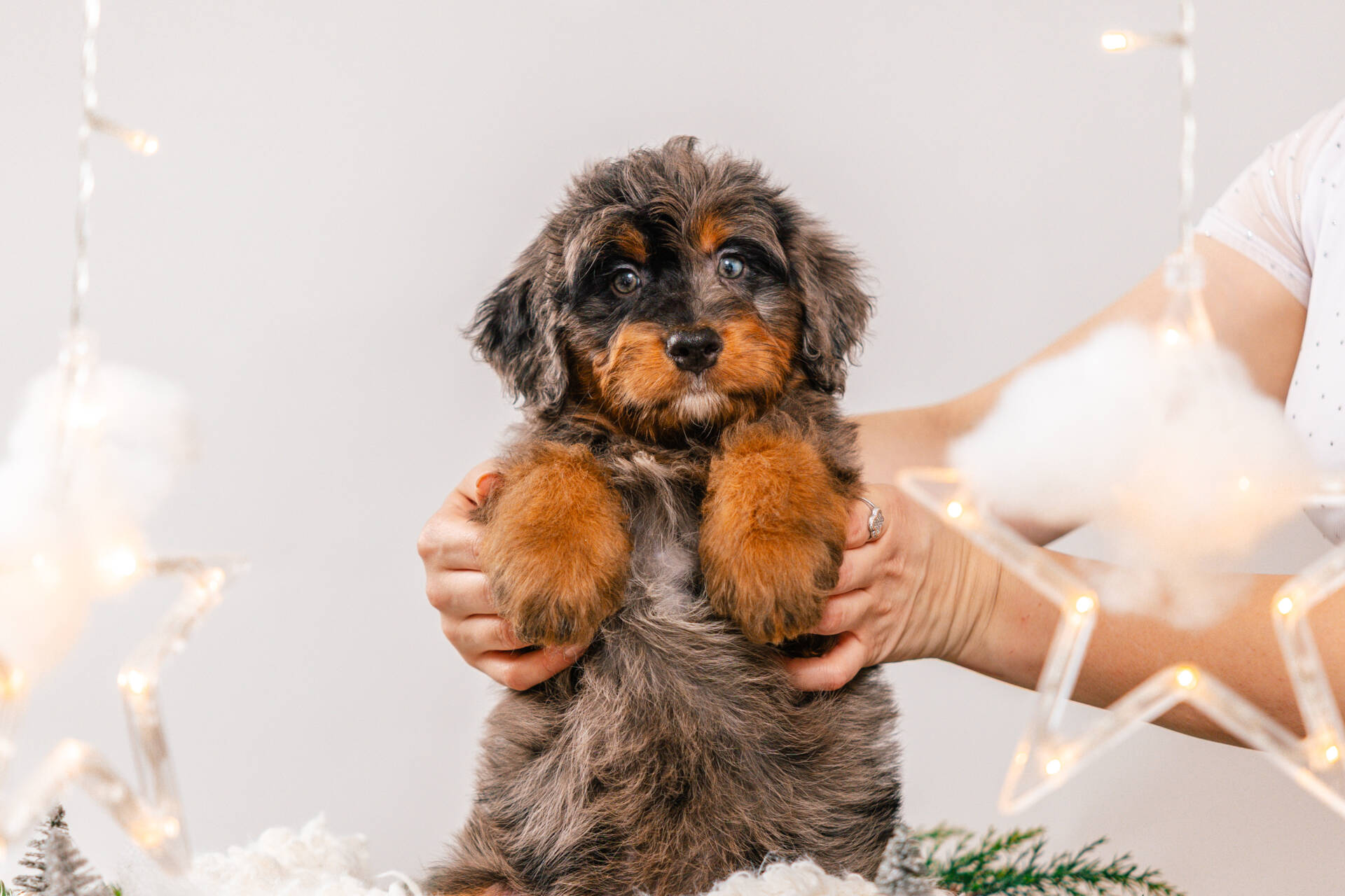 • We Breed: Mini F1 Bernedoodle (Bernese Mountain dog + Mini Poodle)